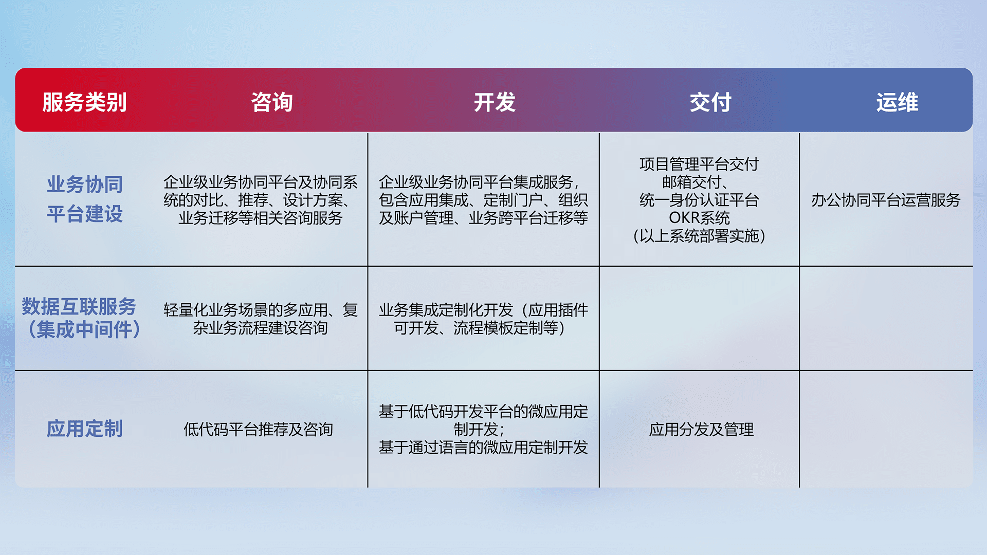 针对钉钉、、企微、、、、IDaas等平台级产品提供产品的规划、、、、方案、、、、交付、、、、定制化开发等服务,,实现如统一协同办公、、智能客户服务、、混合会议管理、、、智能数据查询、、、、等业务场景,,,,实现数字化转型。。