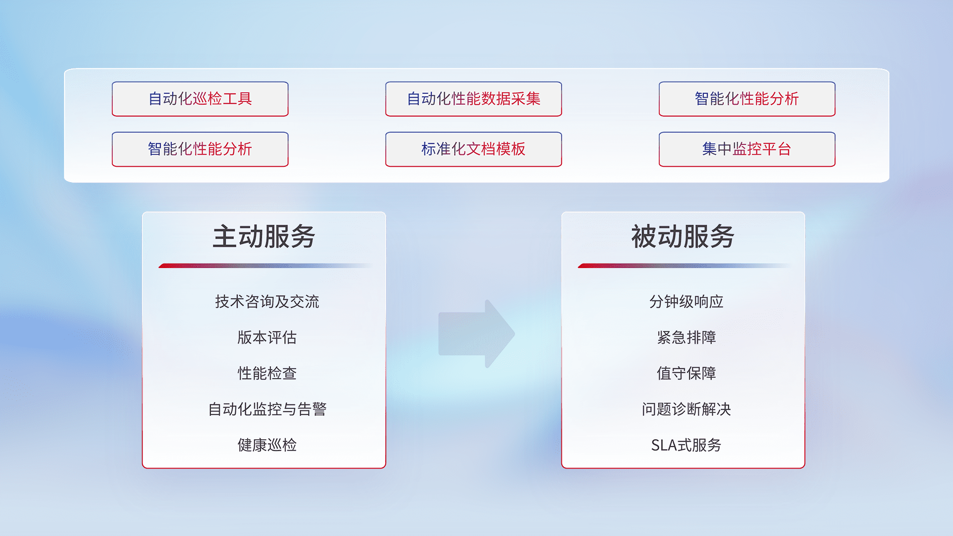 智能化工具和标准化文档,,,保障服务质量,,,提供主动服务(包含技术咨询、、、版本评估、、、、性能检查、、、自动化监控与告警、、健康巡检)和被动服务包含(分钟级响应、、、、紧急排障、、值守保障、、、、问题诊断解决、、、、SLA服务)。。。